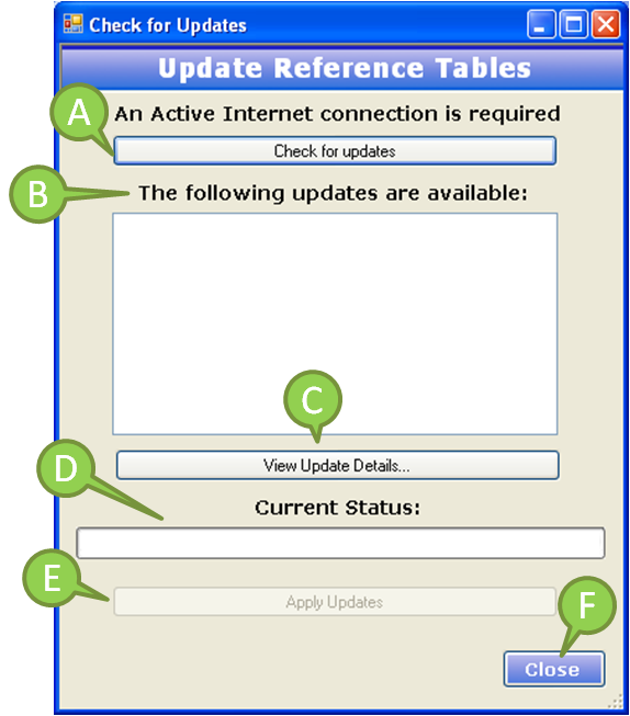 If there is an active Internet connection the AQS QA Transaction Generator will check for updates each time it is started. If updates are available you`ll be prompted to install them, you can elect not to install the updates if you wish. However, it is recommended that you allow the updates to run. The AQS QA Transaction Generator checks for updates to the reference data that it uses and for updates to the AQS QA Transaction Generator. Up to date reference data is vital to make sure the transactions that are generated will be accepted by AQS.