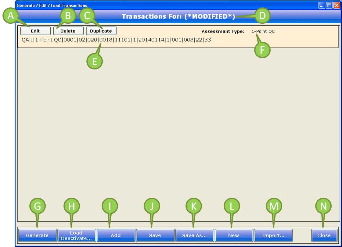 You can manually create an AQS QA Transaction by clicking the Transactions button from the Main Menu. The Generate / Edit / Load Transactions screen will be displayed. To create a list of Transactions click the Add button, select the AQS QA Transaction that you wish to create from the list.